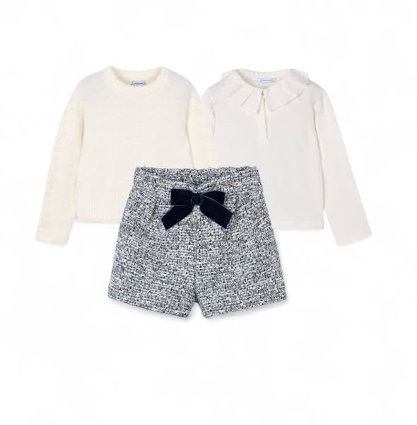 Mayoral Girls Navy Tweed short Set & White Fluffy Sweater
